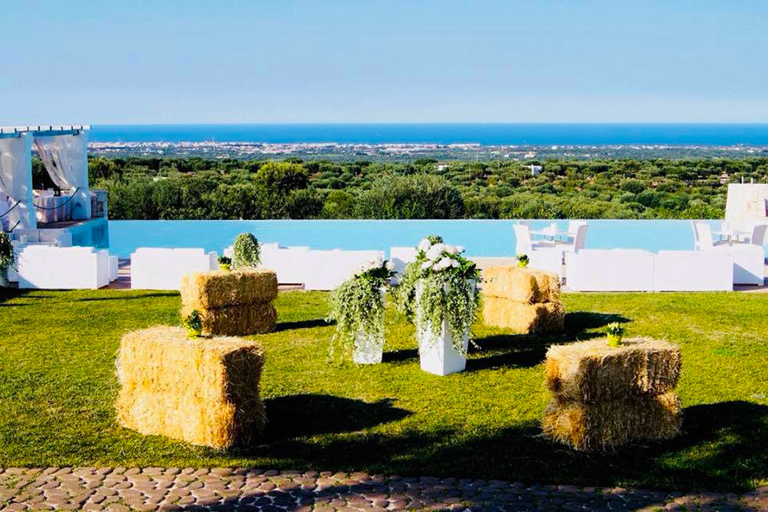 Se siete alla ricerca di un ricevimento unico ed esclusivo, questo è il luogo che fa per voi perché racchiude in sé l’essenza più autentica della nostra terra: la Puglia. Il ricevimento potrà svolgersi in tutta serenità, ambientato in un paesaggio tipico del territorio: tra natura incontaminata e ottima cucina. La struttura dispone anche di una meravigliosa piscina, immersa in un magnifico giardino mediterraneo, all’ombra di ulivi secolari e palme tropicali. Una location unica cui affidare i propri momenti più speciali all’aria aperta, per godere dell’aria salubre che si respira in Puglia e del sole che riscalda l’anima (se scegliete un matrimonio diurno) o di magiche atmosfere (qualora optaste per un matrimonio serale).