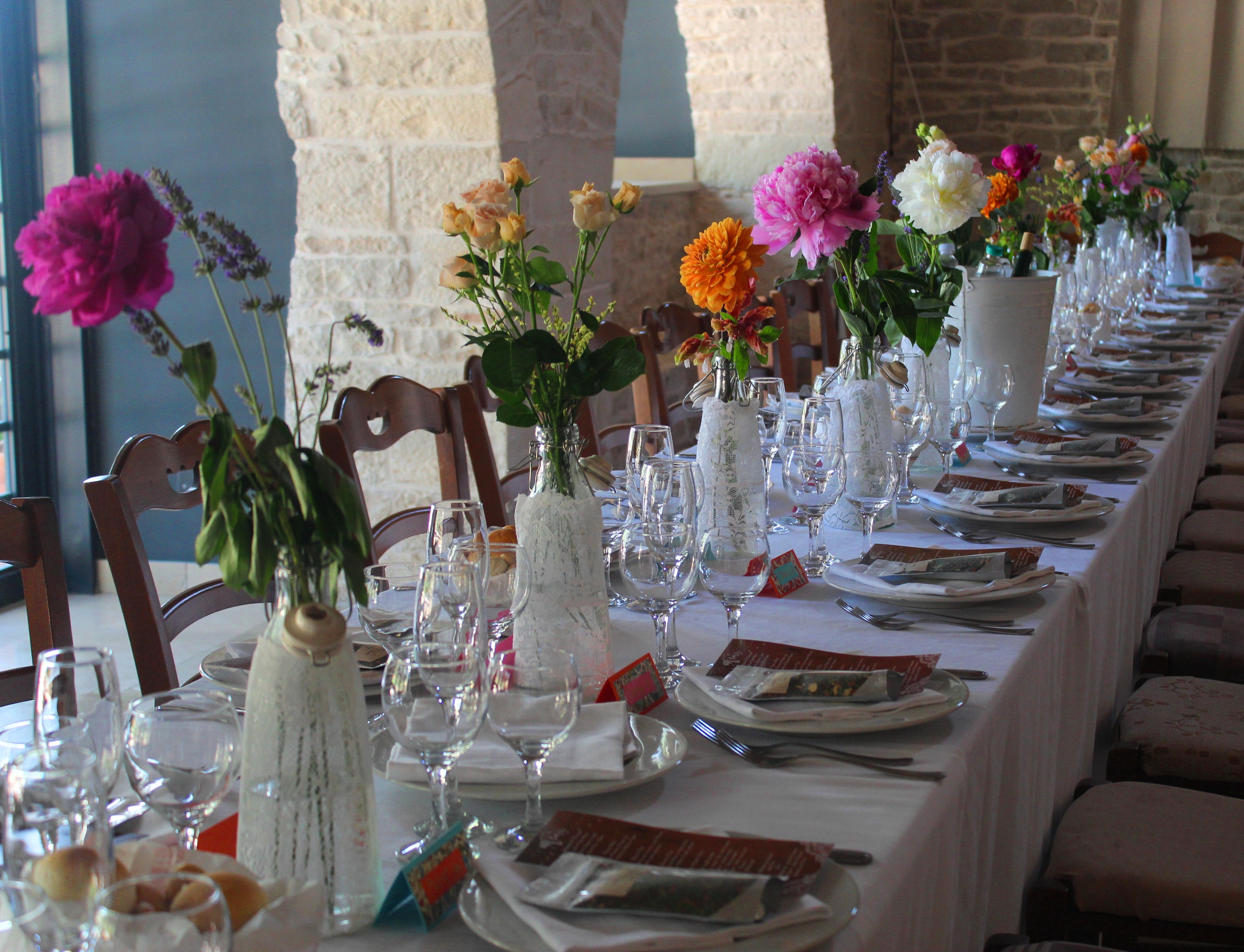 Nel centro tavola abbiamo voluto confermare la linearità data dal tavolo imperiale attraverso una fila di bottiglie in vetro rivestite di pizzo che contenessero fiori recisi posti in acqua.